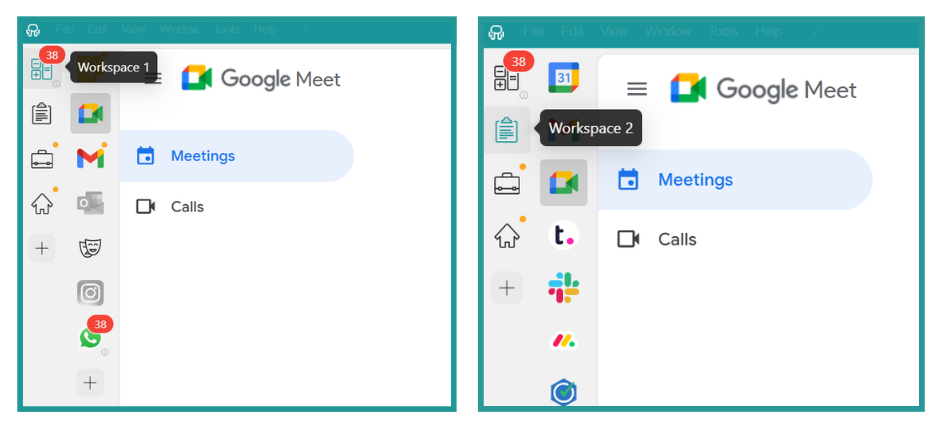 - Rambox 工作区:此功能非常适合保持桌面整洁和高效。如果您将 Google Meet 与多个专业帐户(例如您的主要公司登录帐户和客户或合作伙伴组织提供的另一个帐户)一起使用,Rambox 可以让您将它们分开。您可以设置不同的工作区:一个用于公司工具(Google Meet、Slack、Teams),另一个用于特定于客户的应用程序。这样,您始终清楚地知道每个项目或协作的去向。