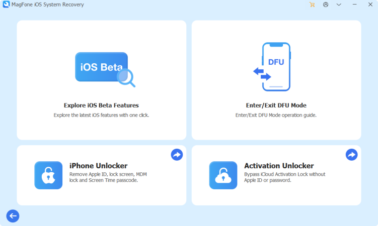 首先,在电脑上下载并安装MagFone iOS System Recovery,然后用USB线将iPhone连接到电脑并打开软件。在软件主界面上,单击“更多工具”按钮,然后选择“探索iOS Beta功能”选项。