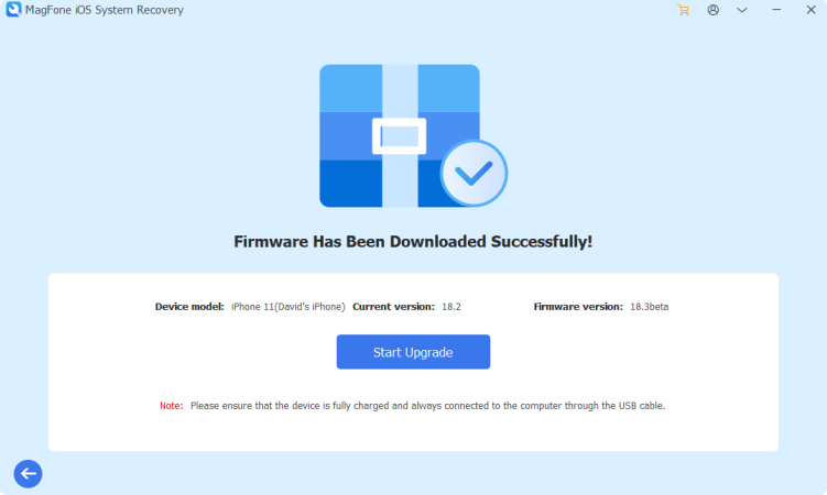 看到下载成功的通知后,您可以单击“开始升级”按钮在您的 iPhone 上安装 iOS Beta。保持设备与计算机的连接,直到该过程完成。如果您后悔安装测试版,可以使用 MagFone 降级。