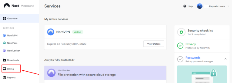 步骤1:登录您的 NordVPN 帐户并选择“计费”在左侧面板上。