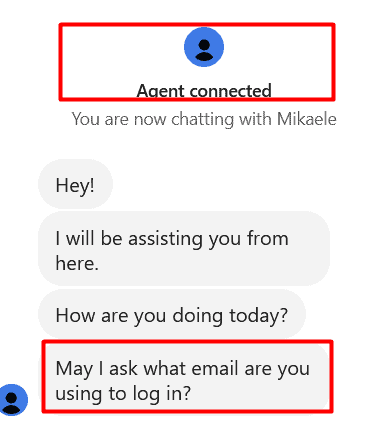 - 您将被引导至现场代理,他会询问您用于验证帐户的电子邮件地址。