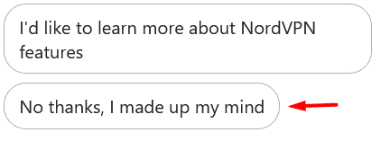 - 聊天机器人会询问您是否想了解有关 NordVPN 可以为您做什么的更多信息,或者是否想要退款。点击 ”不用了,谢谢,我已经下定决心了”。
