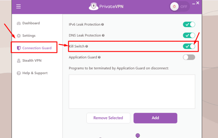 - 转到“连接卫士,”然后切换“终止开关”按钮。这可以防止 YouNow 管理员在 PrivateVPN 断开连接时看到您的 IP 地址,从而导致另一次禁令。
