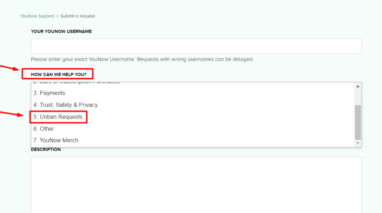 - 使用您的 YouNow 用户名填写表单,然后选择“解禁请求“ 在下面 ”我们能为您提供什么帮助?”