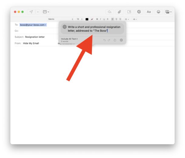 - 输入您要写的电子邮件的描述,例如“写一封专业而简洁的辞职信”
