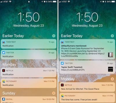 预览通知隐藏(左),然后在 iPhone 解锁后显示(右)