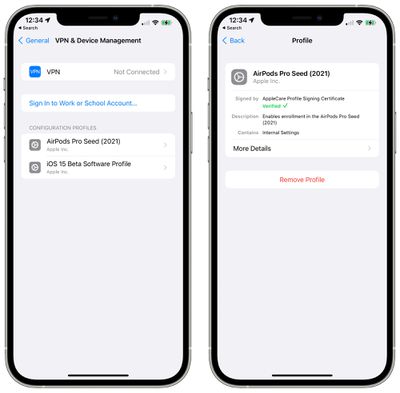 卸载配置文件后,AirPods Pro 将不会收到新的测试版软件更新,但会继续安装测试版软件,直到下一个版本的非测试版软件可用。