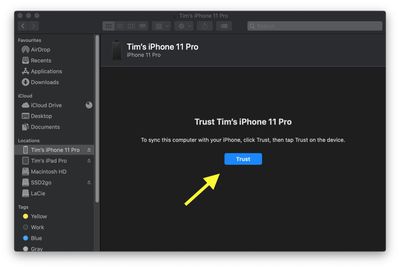 - 如果这是第一次将您的设备连接到 Mac,请单击相信在 Finder 窗口中。