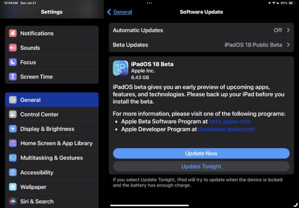 重要的是要记住,运行测试版系统软件(包括 iPadOS 18 公开测试版)并不适合所有人,通常只适合高级用户。由于测试版系统软件比最终版本存在更多错误,因此您可能会遇到错误、崩溃、冻结、性能问题、电池问题和其他通常不属于最终操作系统体验的麻烦。如果您对运行测试版相关的风险感到满意,您会发现将 iPadOS 18 公共测试版安装到 iPad 上非常容易。