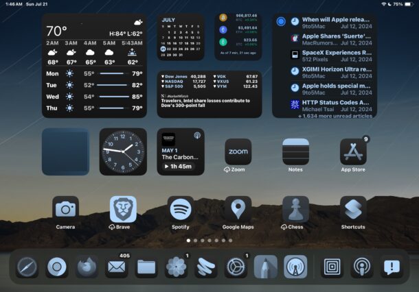 稍后,您将看到 iPadOS 18 主屏幕,您可以通过更改小部件和图标的色调来自定义主屏幕和主题: