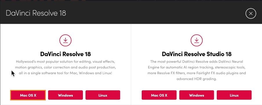 这是 Mac 上 DaVinci Resolve 的官方下载页面。点击立即免费下载,然后选择下载适用于 Mac OS X 及更高版本的 DaVinci Resolve 安装程序。您可能需要输入个人信息来注册帐户,然后才能将该应用程序下载到您的 Mac。根据您的下载速度和整体网络连接,3 GB 的下载可能需要几分钟到一个小时。