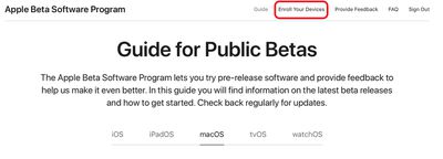 - 登录后,在公共测试版指南页面上,向上滚动到顶部并单击“注册您的设备”,然后单击“macOS”。