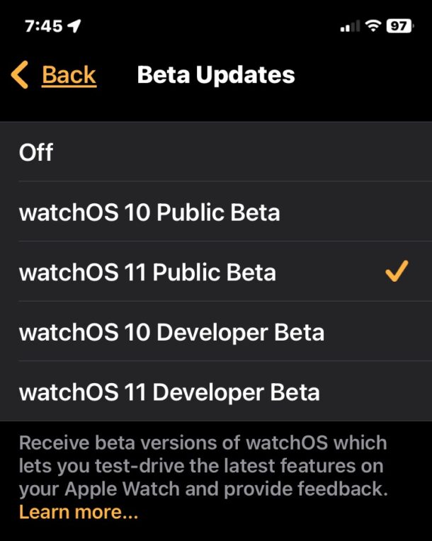 - 选择“watchOS 11 Public Beta”,然后返回软件更新屏幕