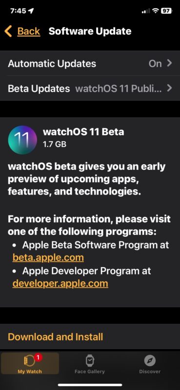 - 当您看到 watchOS 11 公共测试版可供下载时,点击“下载并安装”软件更新
