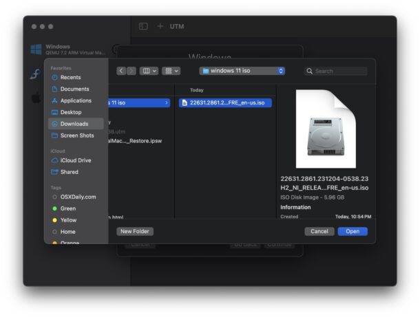 - 选择您在前面的步骤中构建的 Windows 11 ISO,然后选择“打开”