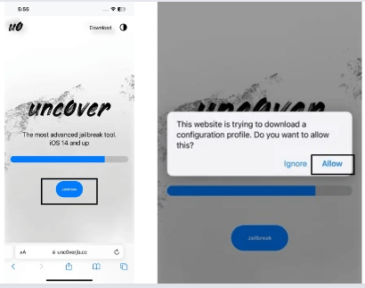 步骤2:访问网站unc0verjb.cc并单击“越狱”按钮。然后,在弹出窗口中单击“允许”。然后转到设置并单击“个人资料已下载。”然后点击“安装”安装它。