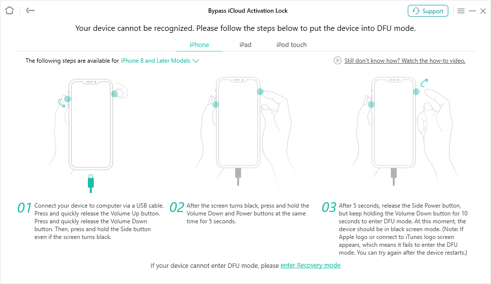 然后,选择您的设备型号并按照屏幕上的说明进行操作。您的设备将进入 DFU 模式。