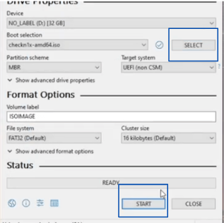步骤2:将 USB 驱动器连接到计算机。下载后,打开 Rufus 软件。单击“选择”按钮并单击下载的 checkn1x iOS 文件。点击“开始。”