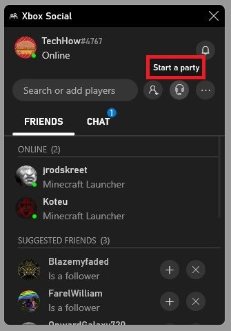 如果这不起作用,您可以创建一个新聚会并从那里邀请用户。单击举办派对图标,然后将打开一个新窗口。您可以从 Xbox Social 窗口上的朋友列表中添加某人。