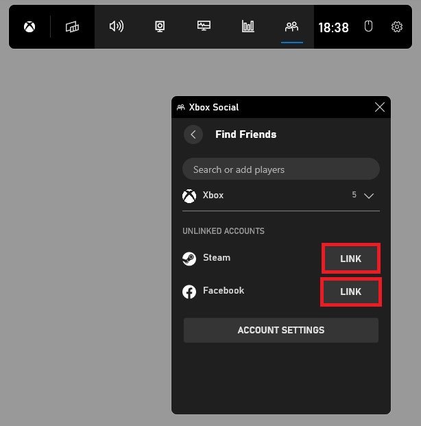 如果用户尚未在列表中,但通过 Steam 或 Facebook 连接,请单击寻找朋友图标,这将允许您关联你的蒸汽和Facebook帐户,以便将来使用 Xbox Social 更轻松地邀请朋友参加您的游戏聚会。
