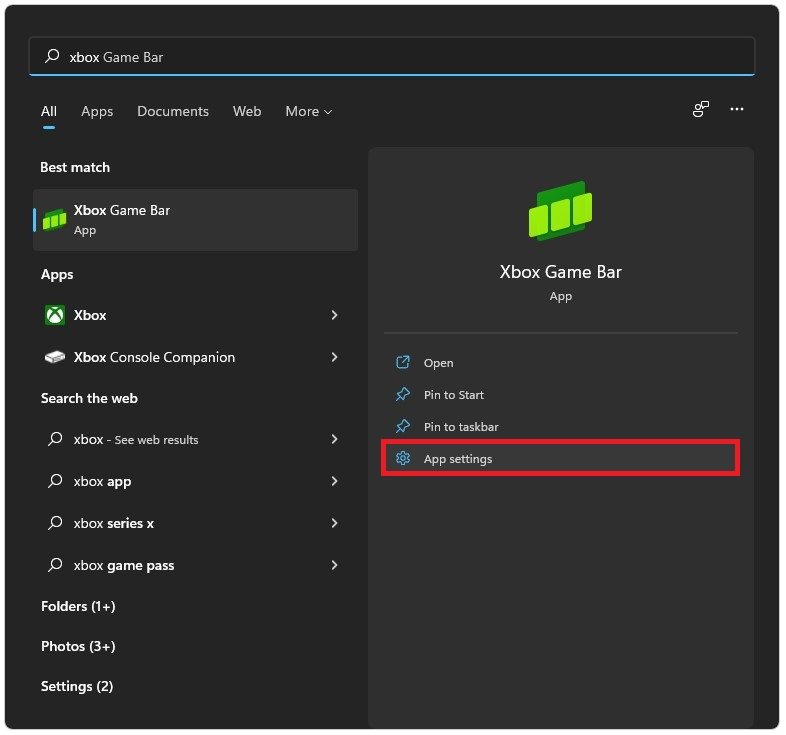 如果您遇到 Xbox Game Bar 问题,请在开始菜单搜索中搜索 Xbox Game Bar,然后单击应用程序设置。