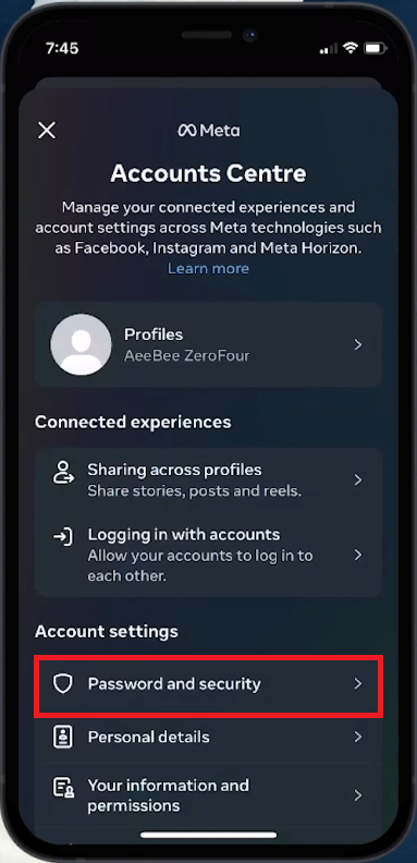 在帐户中心中,找到并选择“密码和安全”。此区域重点关注 Facebook 帐户的安全功能。