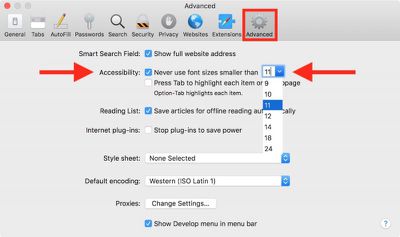 最后,Safari 中有一个选项可以让您强制网站使用最小字体大小显示文本,而不影响缩放级别。