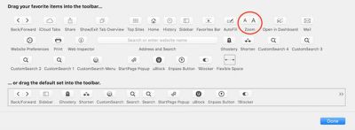 或者,您可以向 Safari 界面添加缩放按钮:右键单击(或按住 Ctrl 键单击)Safari 工具栏中的某个空间,然后单击自定义工具栏...。然后拖动飞涨将下拉列表中的按钮移动到您刚刚在工具栏上单击的空间。点击完毕完成。