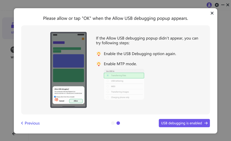 步骤2。启用 Android 手机的 USB 调试。如果您不知道如何操作,AnyMiro 内有一个指南可以告诉您如何操作。