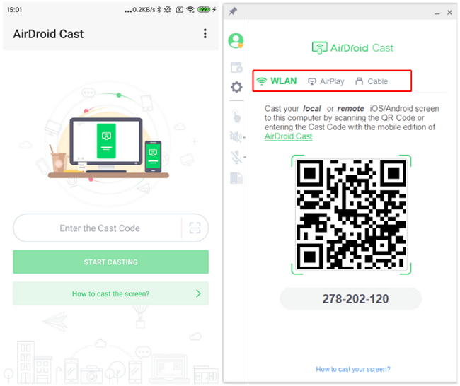 步骤2。在 Android 和 Mac 设备上启动 AirDroid Cast 应用程序。您可以选择使用二维码进行铸造或使用 9 位数字(随机数)铸造代码进行铸造。