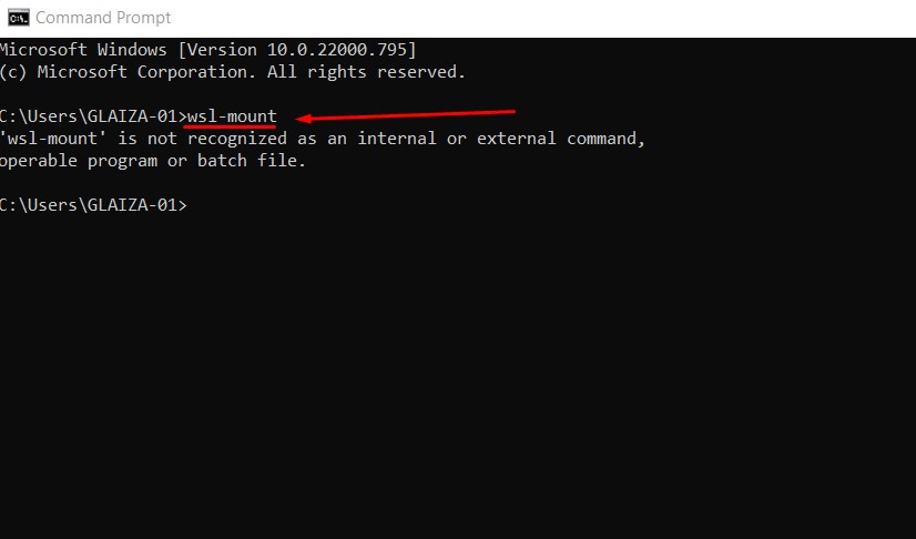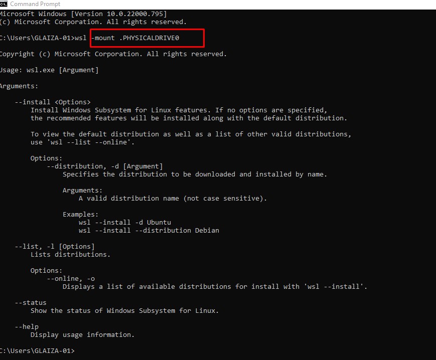 - 输入命令:“wsl-挂载”后跟用于安装该单元的磁盘标识符。