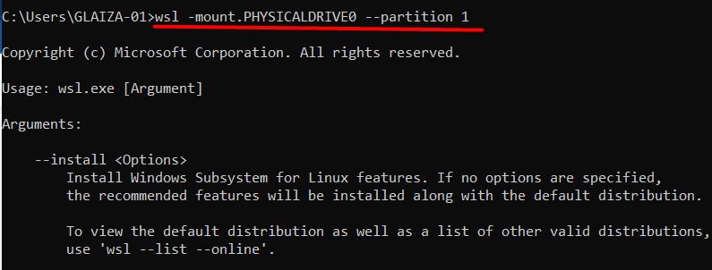 - 然后,命令行将是:wsl –mount.PHYSICALDRIVE0 –分区 1