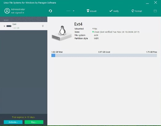 该程序还允许用户安装任何Linux驱动器, 包括外部 2、外部 3、外部 4、XFS、和BTRFS,并像使用它们一样Windows NTFS 驱动器。