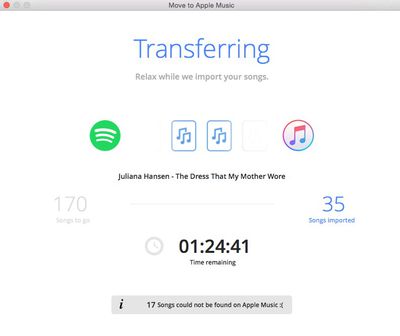 这两个应用程序都无法从每个播放列表中导入每首歌曲。但是,他们俩的准确性大约为70%。该错误很可能是由于Apple Music不支持某些歌曲,或者在Spotify或RDIO中列出的与Apple Music上列出的不同,因此找不到。