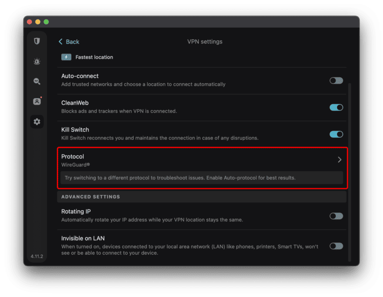 - 您将看到 4 个协议的列表。选择线卫,它为 Adopt Me!、Squid Game 和 Gacha Online 等游戏提供最佳速度。