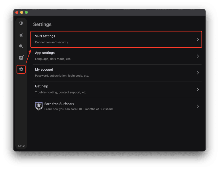 - 点击打开 Surfshark 应用程序设置齿轮图标靠近左面板。然后选择“VPN 设置”。
