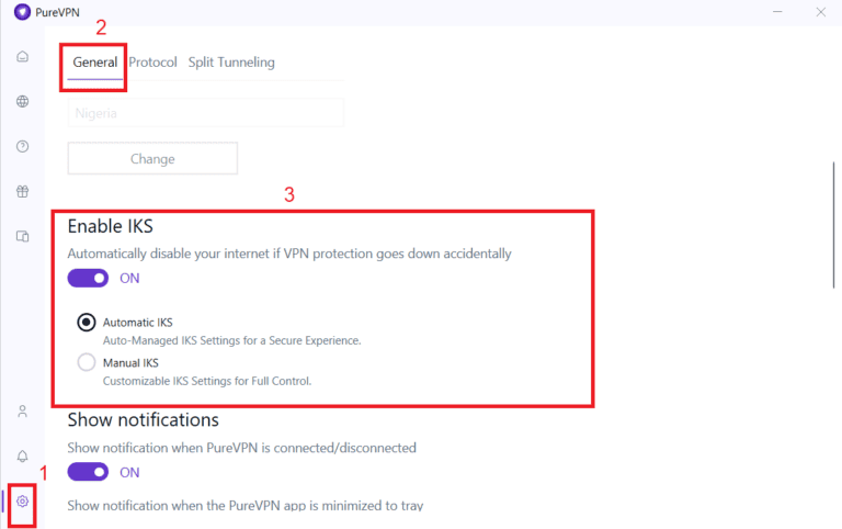 - 启用PureVPN 终止开关这样,如果 VPN 连接突然断开,ISP 和恶意对手就看不到您的真实 IP 地址。经过设置>一般的并切换启用 IKS在。