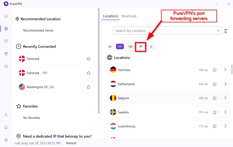 - 连接到不同的 PureVPN 服务器。
