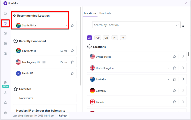 - 选择并连接到合适的 PureVPN 服务器位置,以绕过 IP 禁令并访问无延迟的近战和死灵战斗会话。您可以通过单击连接到最快/最近的 PureVPN 服务器地球图标>推荐地点。