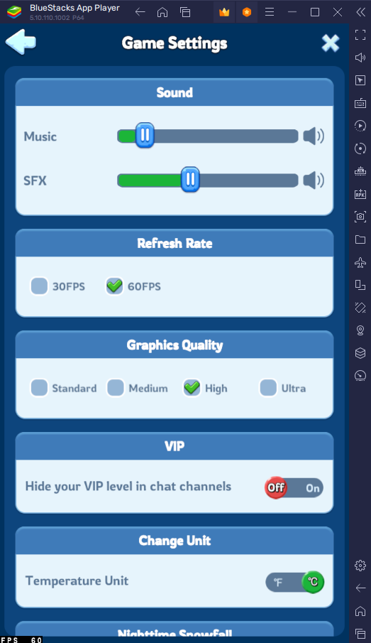 启动 Whiteout Survival 后,导航至游戏内设置以微调您的体验。在游戏设置中,您可以根据自己的喜好调整音乐和音效音量。此外,如果您的 PC 或笔记本电脑可以支持更高的帧速率,请考虑将刷新率提高到 60 FPS,同时记住 BlueStacks 模拟器的性能设置。
