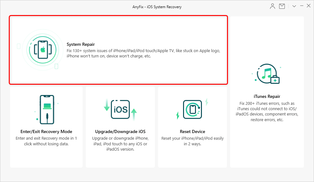步骤1。获取最新版本的 AnyFix在计算机上。然后启动它,您将看到下面的界面。选择系统修复。