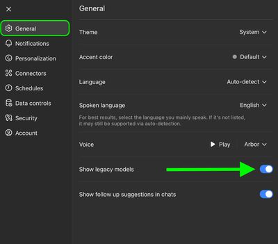 要在 ChatGPT for Mac 应用程序中恢复 GPT-4o,您首先需要通过 Web 界面启用该设置: