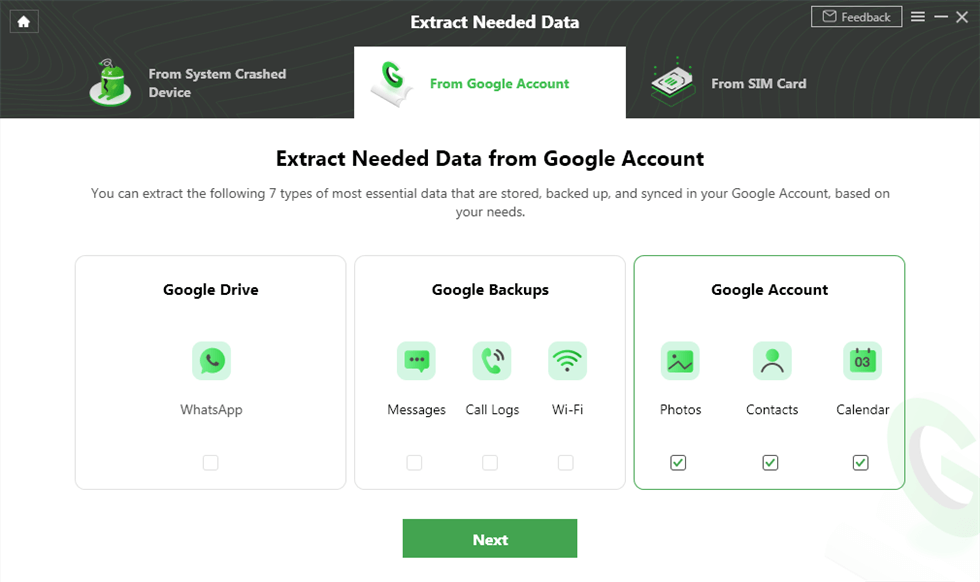 如您所见,官方恢复步骤不支持预览和选择您要从Google帐户恢复的数据。同样,DroidKit 允许您从 Google 帐户中恢复联系人、照片、日历、消息、通话记录和其他重要数据。
