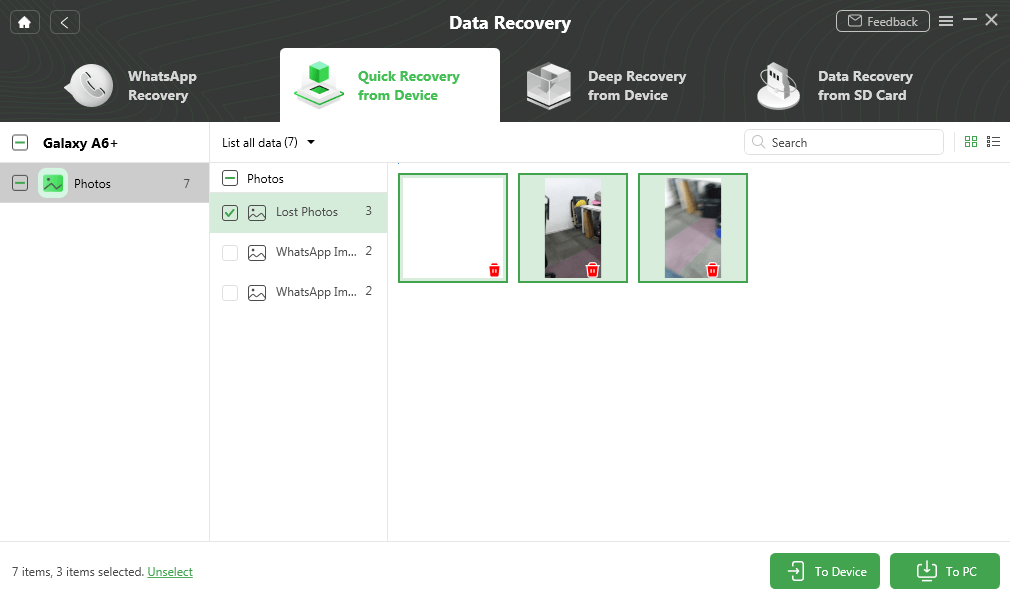 步骤 4。这里,我们以照片为例。您可以在 Android 恢复出厂设置后预览和恢复照片至设备或者至电脑。