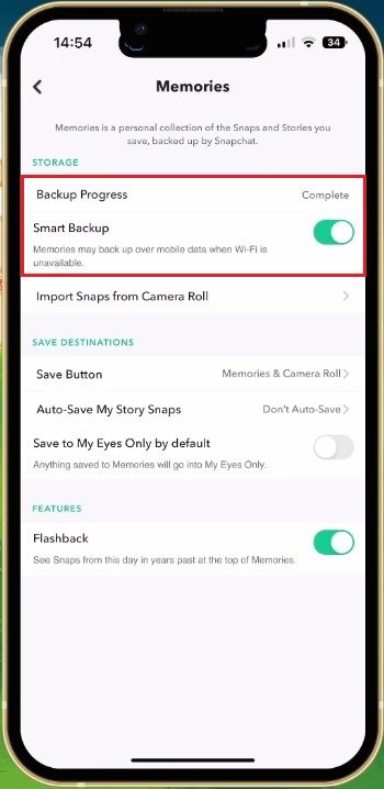 在回忆部分,请确保您的备份进度是完全的。如果情况并非如此,请确保您已连接到 WiFi 网络,因为备份可能会耗尽您的大量蜂窝数据并继续备份您的 Snapchat 记忆。以下选项允许您使用移动数据备份您的记忆。