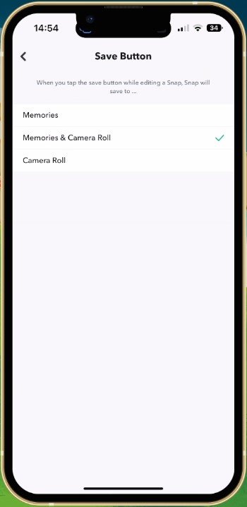 在下面保存目的地,您可以允许 Snapchat 将您的照片和视频保存到 Snapchat 内存、相机胶卷或两者中。