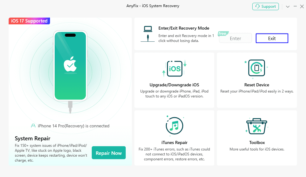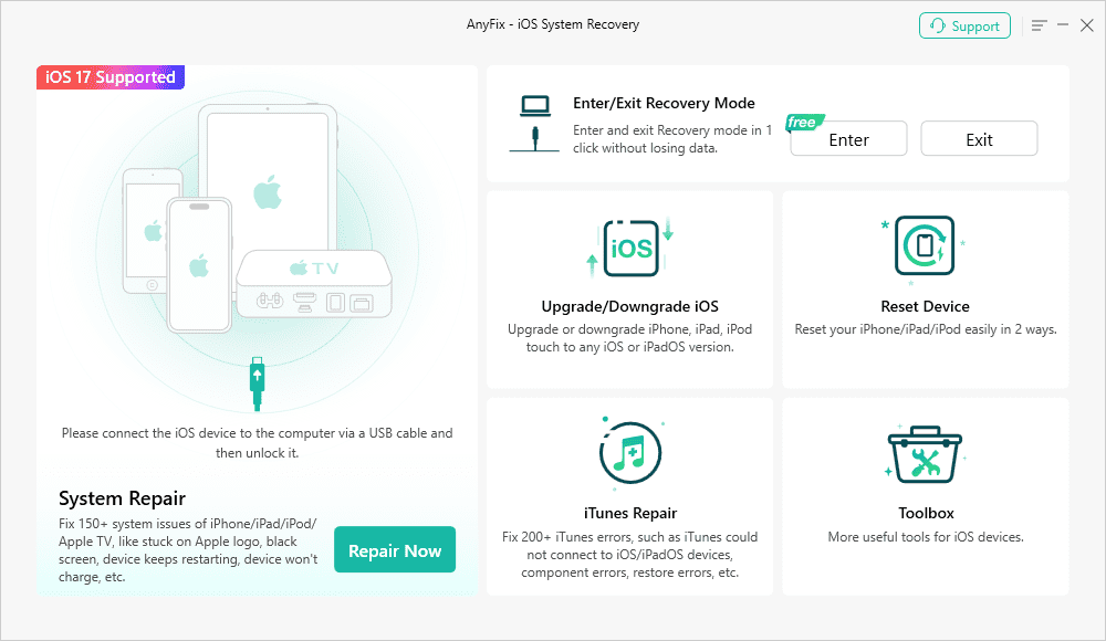 作为一款 iPhone、iTunes、iOS 系统修复工具,AnyFix 支持单击即可退出 iPhone/iPad/iPod 恢复模式。更重要的是什么呢?退出 iPhone 恢复模式时不会有任何数据丢失的风险。但如果您不确定,请检查以下主要功能: