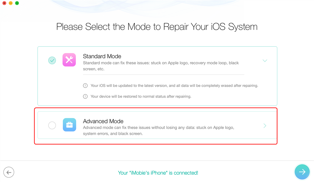 步骤 2. 如标准模式将会删除您 iPhone 上的所有内容,高级模式推荐使用此方法,因为在恢复模式下修复 iPhone 时不会有任何数据丢失的风险。最后,点击下一个按钮并继续。