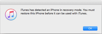 - 当 iTunes 检测到您的 iPhone 时,将会弹出一条消息,提示您必须先恢复您的 iPhone,然后才能使用 iTunes。