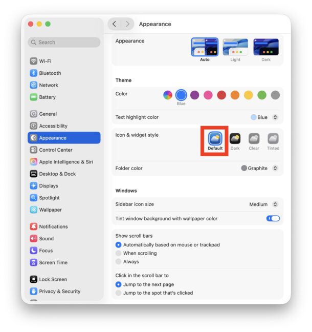 我们将重点对 macOS Tahoe 界面进行两项具体调整,以显着减少 Liquid Glass 界面的外观。首先,我们将关闭透明效果,其次,我们将使用传统图标,而不是“透明”或“有色”选项。